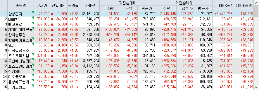 외국인 순매수 상위 종목 삼성전자 1762억원, LG화학 699원, 에코프로 271억원, SK아이이테크놀로지 217억원, 한화솔루션 194억원, 한화에어로스페이스 181억원, SKC 151억원, 한국항공우주 119억원, 포스코퓨처엠 98억원, 두산에너빌리티 98억원, 포스코인터내셔널 92억원 가량 매수