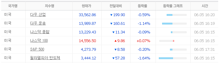 2023년 6월 5일 해외 주식장 마감시황 살펴 보겠습니다.
