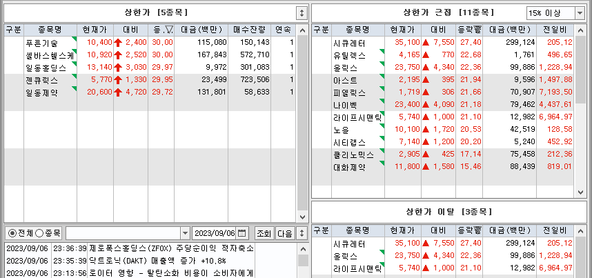 ◆ 2023년 9월 6일 상한가 및 급등주 특징